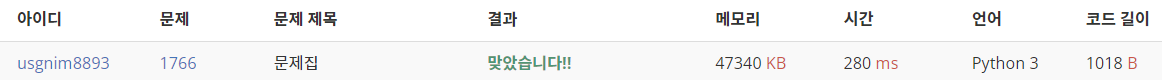 우선, 각 문제들을 하나의 노드라고 생각했을 때, in_degree는 각 문제들의 들어오는 차수들을 저장해놓은 리스트이다. outs는 노드(문제) a가 가리키고 있는 노드들을 집합으로 묶은 딕셔너리이다.